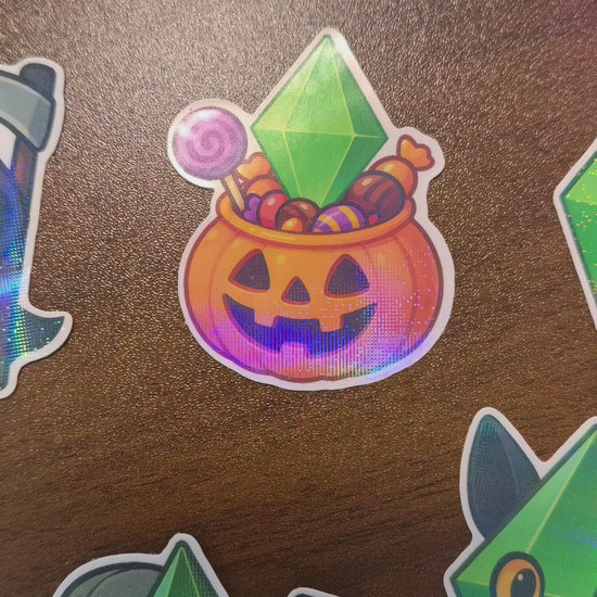 Celebrate spooky season with the Halloween Crystal Inspiration Sticker Pack! Each set includes 10 holographic crystal designs dressed up with playful Halloween vibes such as devil horns, witchy touches, tuxedos, and more. Crafted on high-grade gloss white vinyl, these stickers shine with vibrant colors and smooth durability. Perfect for decorating laptops, journals, and phone cases, or gifting to fellow Sims fans.