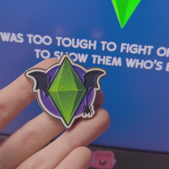 Add a spooky twist to your collection with the Bat Plumbob Halloween Pin! Designed with bat wings and a dangling spider, this enamel pin captures the playful Halloween spirit. Crafted from durable enamel with fine details, it comes with a themed back card featuring pumpkins, spider webs, and ghosts. Perfect for Sims fans who love festive collectibles.