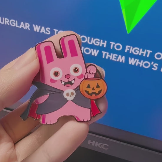 Bring Halloween cuteness to life with the Vampire Freezer Bunny Enamel Pin! This adorable design shows the iconic bunny dressed as a sweet little vampire, holding a pumpkin bucket with playful charm. Crafted from durable enamel, the pin sparkles with festive detail and comes with a matching haunted night back card. A delightful collectible or gift for Sims fans who love spooky fun with a cute twist.