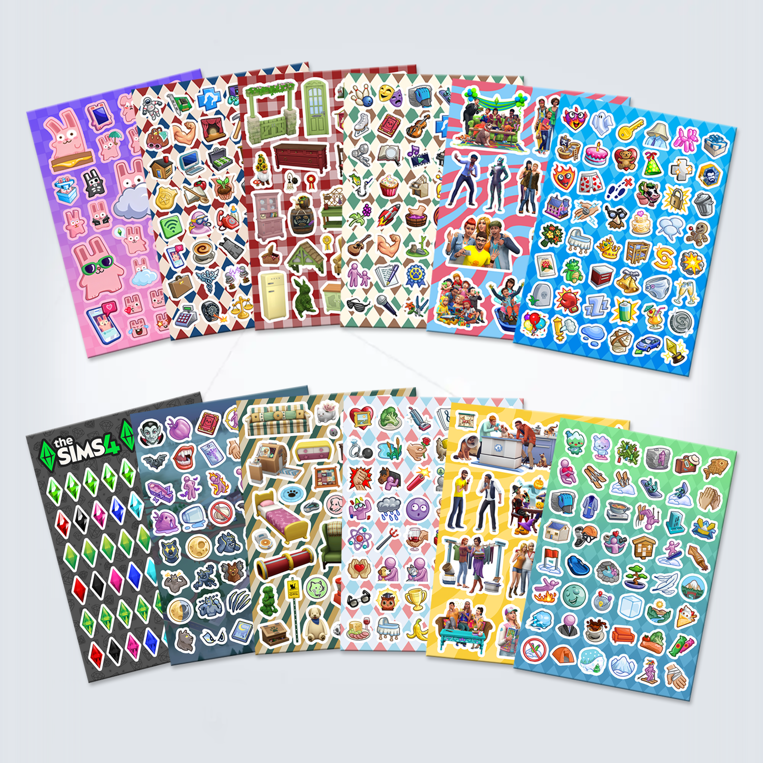Get all twelve sticker sets in one collection. From furniture and NPCs to Plumbobs, snowy adventures, vampires, careers, skills, traits and more, these waterproof and reusable matte stickers can decorate notebooks, laptops, water bottles, phone cases, planners or mugs. Stick them, peel them and turn everyday items into playful Sims adventures.